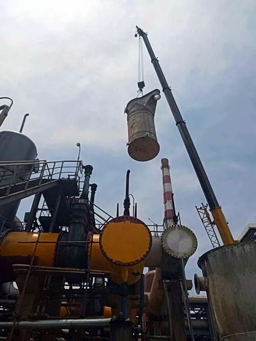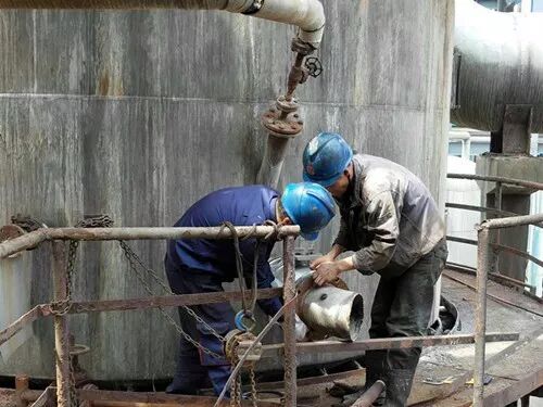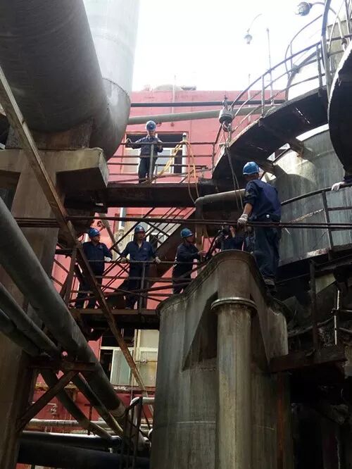 7月19日上午,按照既定计划安排,8:00蒸氨停车、9:00开始检修。检修人员全部到位、拉好警戒线、吊车和消防器材准备就绪、严阵以待。明确安全注意事项后,大家马上行动起来。硫铵工艺小组首先对蒸氨塔进行了蒸汽吹扫、泄压、置换,然后将现场进行了清理。检修人员则兵分两路,检修一组负责蒸氨饱和器进出口加盲板改造,检修二组负责蒸氨满流槽的更换。饱和器加盲板是在蒸氨二层平台上进行,属于高空作业,且受空间限制,使检修人员工作起来非常不方便,他们彼此相互提醒、配合默契,熟练运用着手上的工具,卸螺丝、装阀门、禁锢出口阀门、盲板安装,在吊车的密切配合下,饱和器进出口阀门加盲板全部到位。